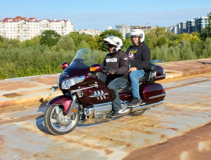 Руслан Марцінків (з правого боку) на мотоциклі їде Пасічнянським мостом. Facebook/Руслан Марцінків