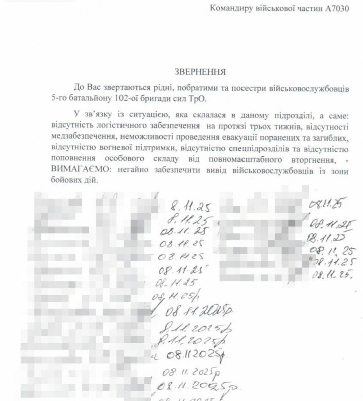 8 листопада 2025 року. У Калуші рідні та побратими військових 5 батальйону (нова назва колишнього 79 батальйону) 102 окремої бригади територіальної оборони Івано-Франківщини починають збирати підписи під зверненням до командира частини із закликом відвести особовий склад від лінії бойового зіткнення на Запорізькому напрямку. Вони стверджували, що упродовж трьох тижнів в зоні відповідальності підрозділу відсутні логістика, медичне забезпечення та неможливе проведення евакуації поранених і полеглих.