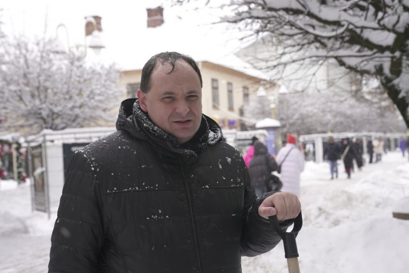 Голова Івано-Франківської громади Руслан Марцінків відкидає сніг лопатою на "стометрівці". До такої роботи, каже, він із колегами долучився через нестачу комунальників.