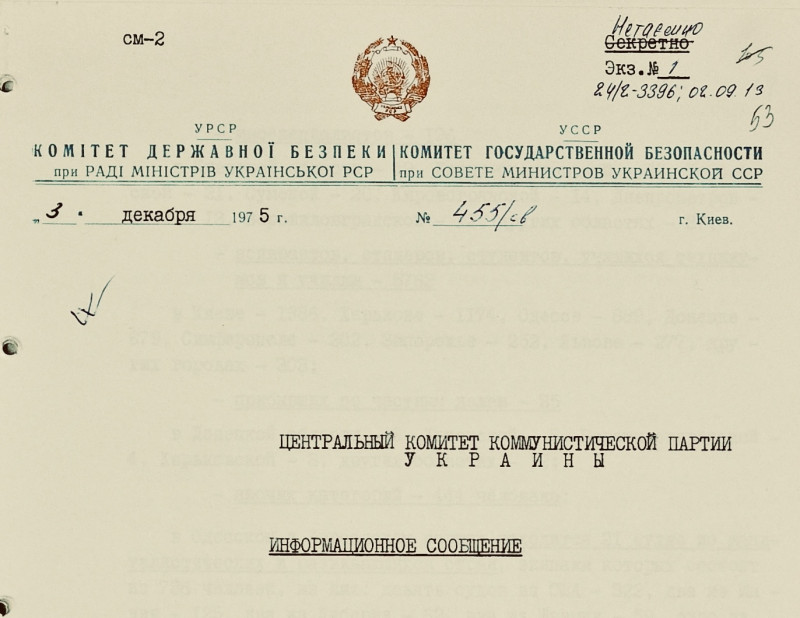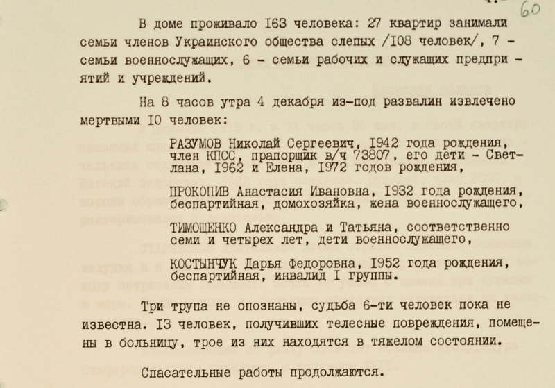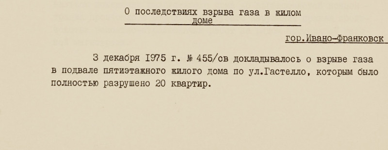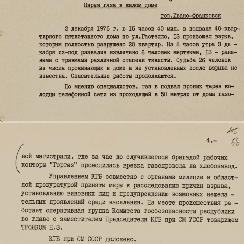 Доповіді КДБ про вибух у житловому будинку на вулиці Гастелло за 2-6 грудня 1975 року. Галузевий державний архів Служби безпеки України