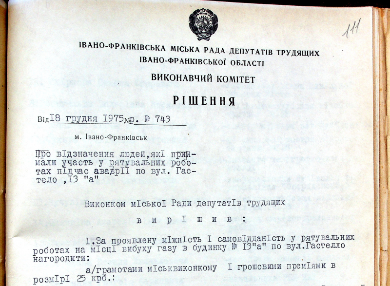 Рішення виконавчого комітету Івано-Франківської міської ради про відзначення учасників рятувальних робіт на Гастелло, 13 А Державний архів Івано-Франківської області