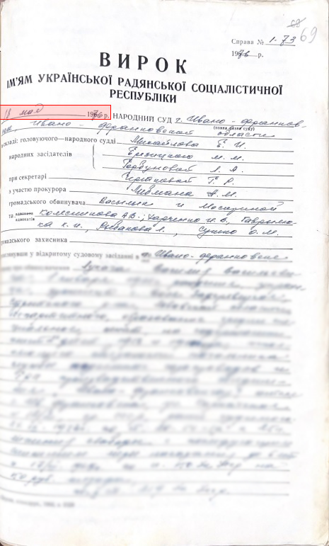 Вирок Івано-Франківського народного суду від 18 травня 1976 року. Архів Івано-Франківського міського суду