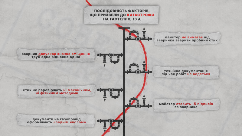 Для електрозварника Івана Критовича, спеціаліста п’ятого розряду з восьмирічним стажем роботи, трубопровід середнього тиску на Гастелло був уже другим об’єктом такого типу. Поклавшись на досвід колеги, майстер Валентин Смола, сантехнік за освітою, який керував зварювальними роботами, не вимагав від зварника проварити пробний стик, щоб перевірити шов на міцність. Це — перша критична помилка, якої припускаються працівники СУ-531.