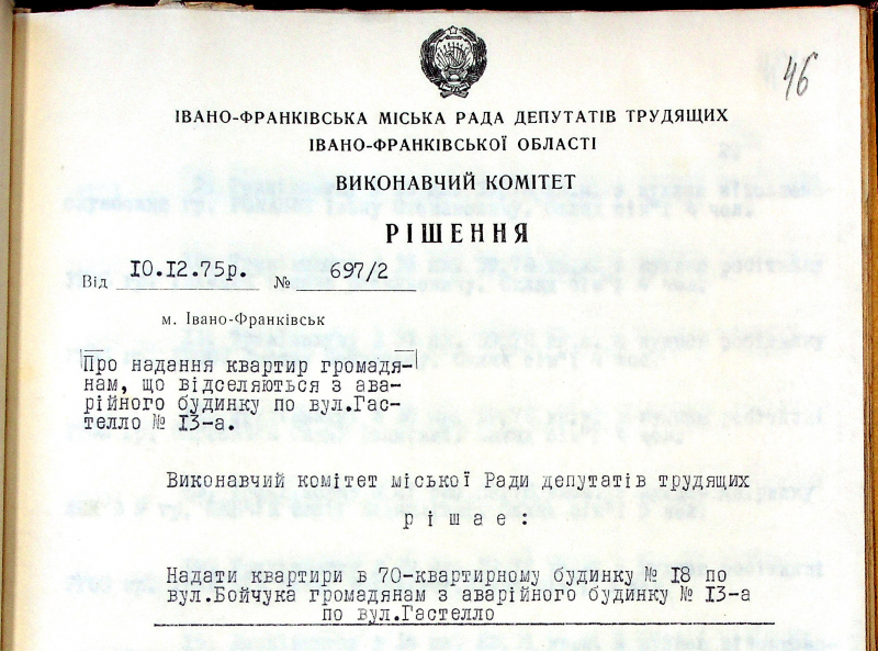 Рішення виконавчого комітету Івано-Франківської міської ради про надання жителям зруйнованого будинку нових квартир. Державний архів Івано-Франківської області
