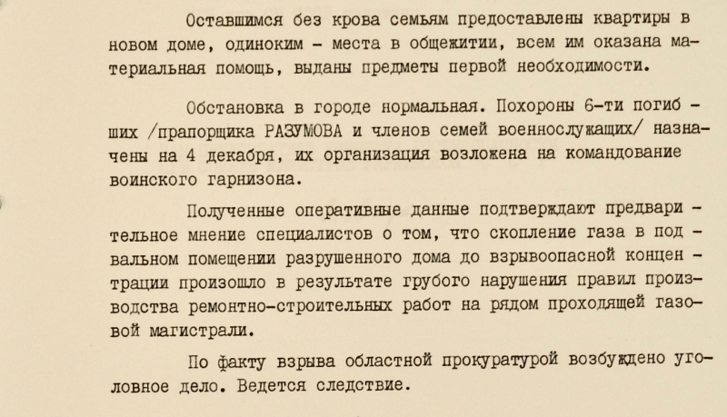 У наступній доповіді цю версію підтвердять і доповнять: "Скупчення газу в підвальному приміщенні будинку до вибухонебезпечної концентрації відбулося в результаті грубого порушення правил виробництва ремонтно-будівельних робіт на газовій магістралі, що проходила поруч".