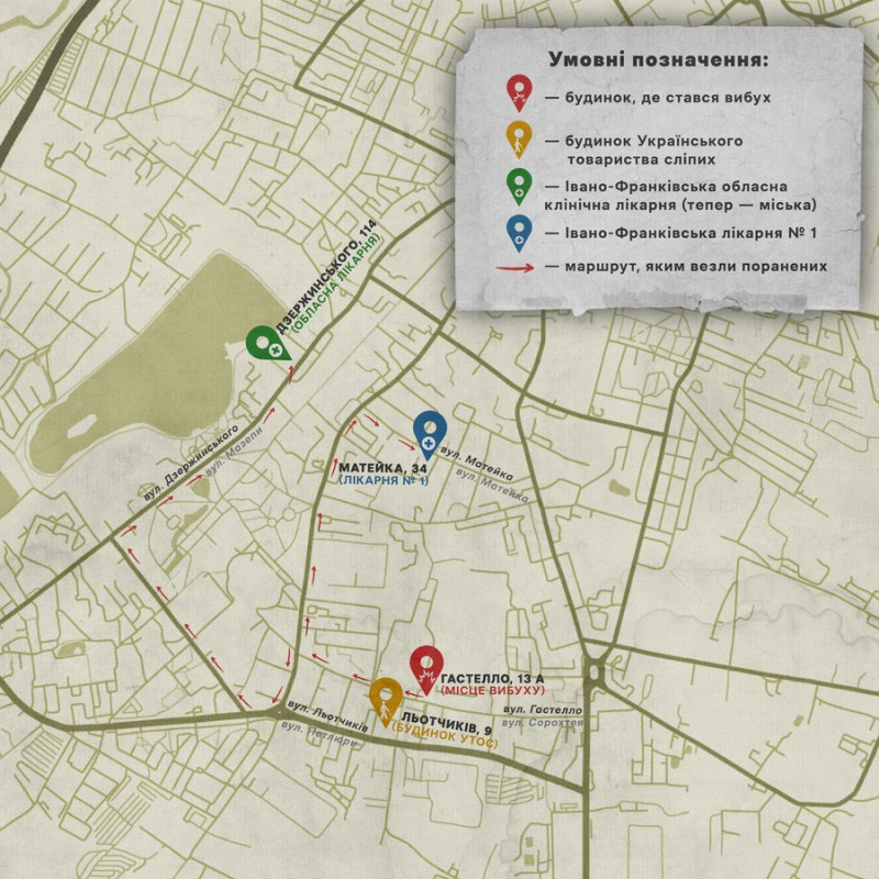 Мапа основних локацій, пов’язаних із вибухом на Гастелло, 13 А. Інфографіка: Суспільне Івано-Франківськ/Діана Яців