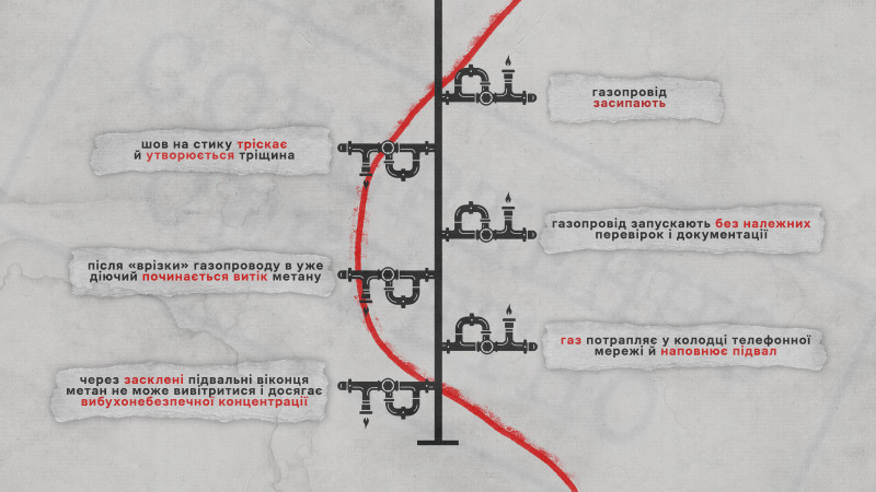 Через тріщину з труби метан потрапив у телефонну каналізацію і впродовж трьох годин наповнював підвал. У будинку на Гастелло, 13 А він був збудований на всю довжину будівлі. Поруч із підвалом розміщувалося технічне підпілля — простір, спроєктований спеціально для інженерних комунікацій, зокрема телефонних кабелів.