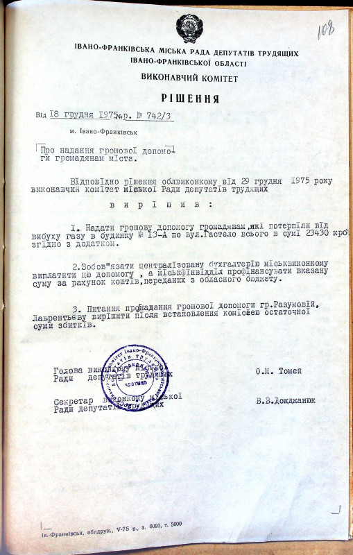 Рішення виконавчого комітету Івано-Франківської міської ради про надання компенсацій постраждалим під час трагедії на вулиці Гастелло, 13 А Державний архів Івано-Франківської області
