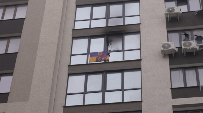 Прапор з портретом Володимира Синьківа майорить з вікна пошкодженої вогнем квартири Олени. Суспільне Івано-Франківськ