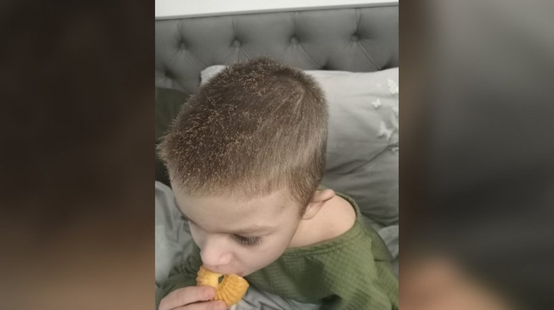 Підгоріле волосся у сина Олени Синьків після пожежі, що спалахнула у багатоповерхівці в Угорниках 20 січня 2026 року. Надала Суспільному Олена Синьків