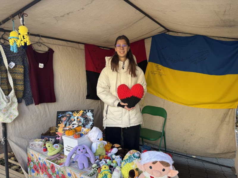 Вікторія Шумахер з матір'ю прийшла на ярмарок з в'язаними виробами, випічкою, картинами та книгами. Зараз на війні перебуває її батько. Дівчина волонтерить з 2022 року.