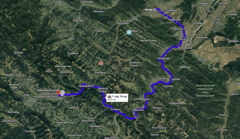 Маршрут, яким везли Леоніда Бойчука до Верховини, 11 серпня 2025 року. Скриншот з Google Maps