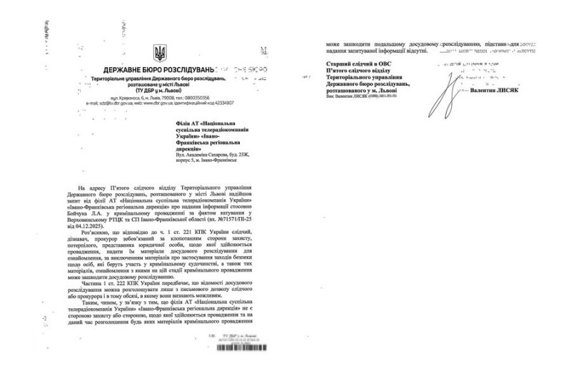 Відповідь Територіального управління ДБР у Львові на інформаційний запит Суспільного стосовно справи про катування у Верховинському районному ТЦК та СП. Державне бюро розслідувань