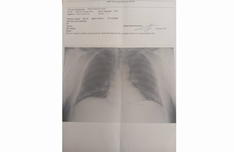 "Садив нас працівник ТЦК в окулярах, "айтівець", який сидів за комп'ютером і оформляв всі документи. Водієм був високий бородатий чоловік. Вони повезли нас до медзакладу — не знаю, чи то була Верховинська районна лікарня, чи поліклініка. Спочатку мені зробила жінка кардіограму. І після цього "айтівець" та Анатолій Ч. повели мене на флюорографію. Сказали: "Роздягайся". Я відповів, що у 2024 році хворів на гострий бронхіт, і в Кутській лікарні мені робили флюорографію на новому апараті. Двічі — до хвороби і після. Просив їх зробити запит через Helsi", — пригадує Леонід Бойчук.