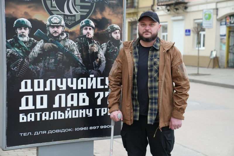 Михайло Вовк біля рекламного щита із закликом долучатися до його батальйону, Коломия, 2026 року. Суспільне Івано-Франківськ/Ігор Попик
