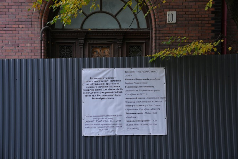 В Івано-Франківську почали реставраційні та ремонтні роботи у кам'яниці на вулиці Гординського, 10, яка є приватною власністю. Встановлення будівельного паркану поблизу будинку помітила працівниця Суспільного 9 жовтня 2025 року. 13 жовтня з'явився банер з інформацією про реставрацію і ремонт.