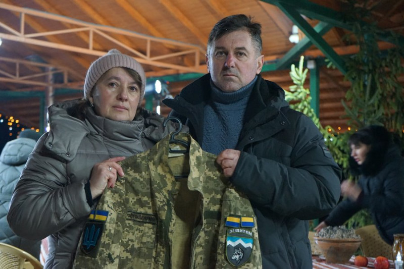 Людмила Неспяк та її чоловік Василь Неспяк із формою сина, село Новий Мартинів, 23 грудня 2025 року. Суспільне Івано-Франківськ/Юлія Чаборак