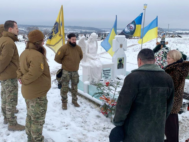 Побратими полеглого “азовця” та матір Ореста-Микола Василечка на його могилі, Старий Лисець, 25 грудня 2025 року. Facebook/Лисецька селищна рада