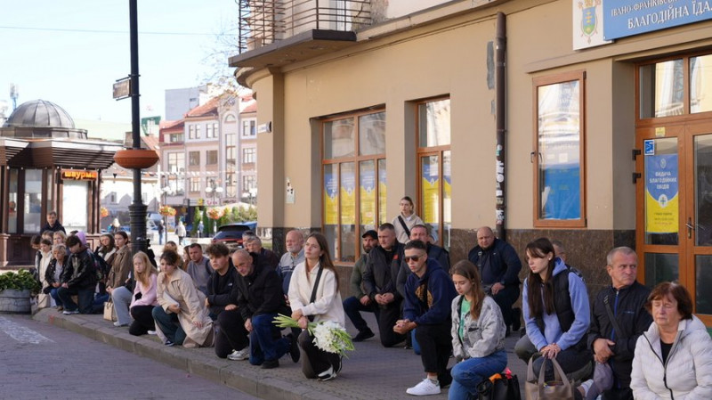 Жителі Івано-Франківська ставали на коліна під час проїзду скороботного кортежу з тілом воїна Романа Веркальця, 26 вересня 2025. Суспільне Івано-Франківськ