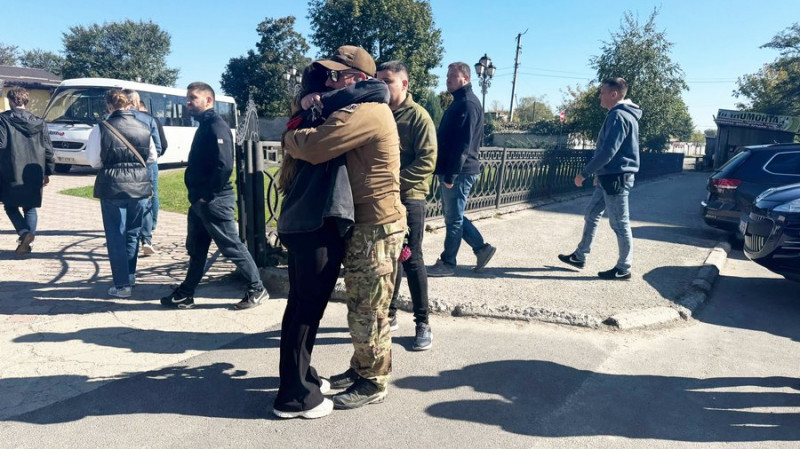 Військовий Ігор Чернецький обіймає жінку на прощанні з Тарасом Шпуком, Івано-Франківськ, 26 вересня 2025. Суспільне Івано-Франківськ/Степан Пенкалюк